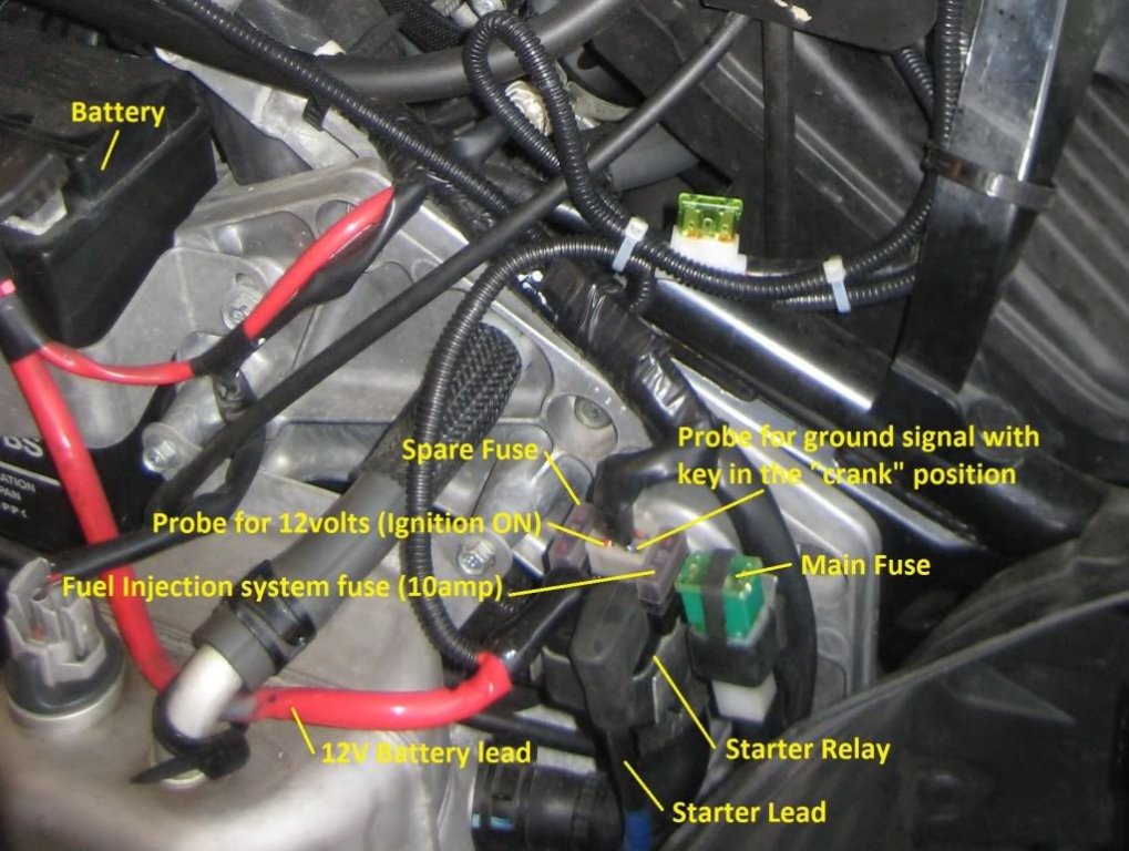 Grizz, fantastic research and wiring information. What did you do to power "add-on" items as far as connections to the battery, ground, avoiding multiple in-line fuses holders, etc. In my front end+ rebuild thread I am now into the HID install and first order of business was loom the rats nest of wires from the YamaHeater behind the headlamp in order to have enough space to then put in the HID harnesses and various control boxes and allow clean air flow to the radiator. As part of my looming, I had to extend the power and ground wires for the YamaHeater as well as a replacement left grip wire done in the past otherwise you could not lift the entire harness to access and remove the airbox cover (I added SB air medallions on the cover). Both of the power connections were somewhat hacked and connected to old in-line fuse holders tie wrapped to the battery wire to the starter relay (see pic) resulting in three power wires on the relay bolt: battery (stock), YamaHeater, Grips. I removed these last night as I don't like putting multiple wires direct on the battery of starter relay if I can help it so in the field repairs are logical and you can isolate add-ons with a simple known fuse pull if needed. Seems like maybe you or others have a power distribution solution for add-on items. I could add one new power feed off the battery to an aftermarket motorcycle fuse box and clean everything up (assuming such an item exists). I plan to power these add-ons: YamaHeater, PowerMadd handguard LEDs, HIDs, heated shield, GPS (future). Brings up the question of what can our nytro power systems handle for a draw? Currently I have a battery tender as the only extra wires directly off the battery with the lead up by the bars for easy connection. Curious what others have done for add-on power / ground systems.