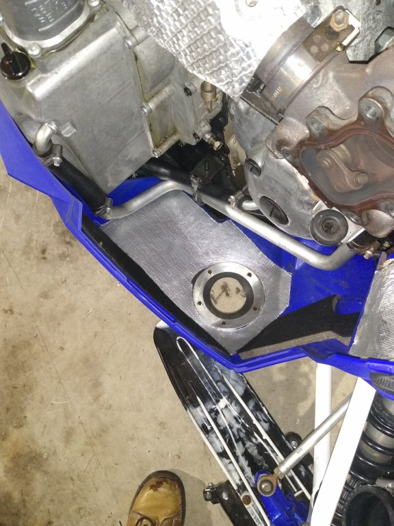 So, I was able to find an aluminum reducer (ROV delete) and slip the end thru the hole next the chaincase.