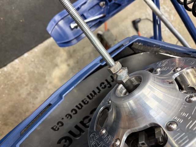 I use a real soft secondary spring in the secondary with no twist on it to keep belt pressure on when putting the secondary together. I took a old long clutch bolt and welded a nut on it for the pulling of the primary using threaded redi-rod. Used the old Ski Doo clutch compressor to push the primary over as a spring or clutch compressor. You can see my straight edge I use with a couple nuts that are exactly the same height under it with just a bungee to hold the straight edge on to the secondary clutch and spacer nuts. I take all shims out behind the secondary so the secondary can be moved in and out to get the perfect offset. Measure the belt to straight edge front and back till its exactly perfect. See pics for reference. You can cobble together what ever things you have laying around the shop, but the basics are laid out here for you to get idea on how to align on any machine with any clutch or belt being used. Use common sense from these photos. I'm using the dividers in the photo only for reference on belt measurements and for the photo on where to measure. Typically, I use the both the divider and the digital calipers to get the measurement exact for proper offset. Once you jig something up you can play with it to see how moving the secondary in and out changes the alignment for the offset with the belt under tension as its being run. Hope this makes sense, but the photos should lead you to the cobble needed to get the job done, doesn't need to be pretty, just needs to be accurate. Once you get it right. Measure the shaft to outside of secondary to get the spacing you need. On my 23 right now, I sit the secondary right against the snap ring and bolt it tight for perfect clutch alignment with the TAPP. I can't machine anything off the secondary or remove the snap ring or the secondary will hit the aluminum frame hard on full shift. It just ever so slightly rubs it as it is now with the snap ring in place. The center to center is longer on my 23 vs my old 17 so the movable in the secondary moves further as it goes into a higher OD than the 17 did. This is why I have ended up with 1.5 mm more offset on my 23 than the 17 was with the same setup on it.