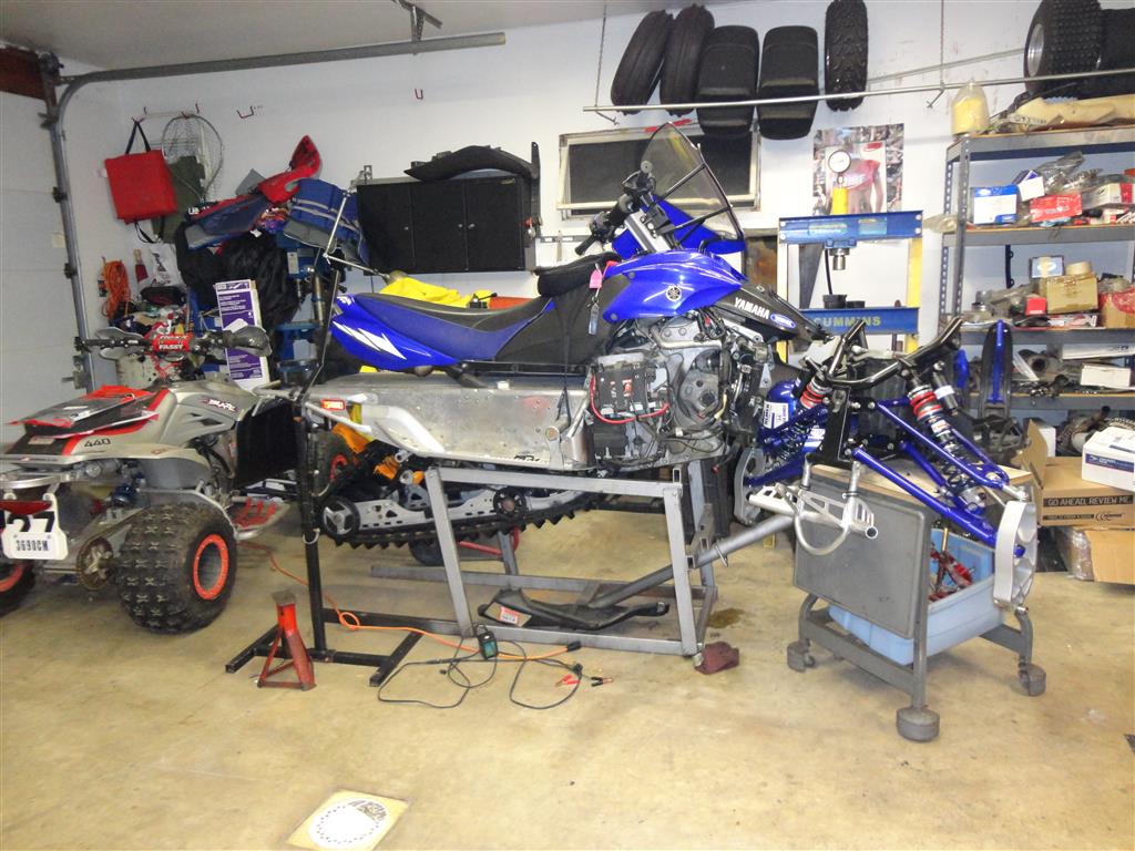 11800 mi and plan to keep the Phazer for that many more so it has come time for a full restoration. Starting at front.Balljoints which had the two piece aftermarket races were bagged out along with upper joints. Also had a bent upper left a-arm that I couldnt bend back.Also needed a filter change. Found a crack in lower oiltank mount so fixing that also.