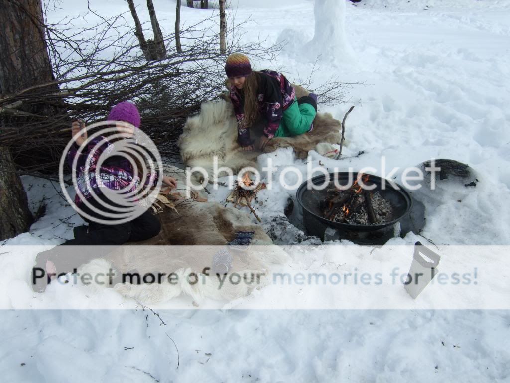Next day, more campfire, we love beeing outside. The reindeer hydes keeps us work, the snowmobile gear works great as well. The girls have their own mini campfire.