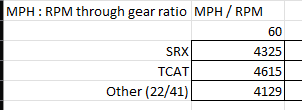 Top is SRX stock, middle is TCAT 24/50, bottom is 22/41 gearing