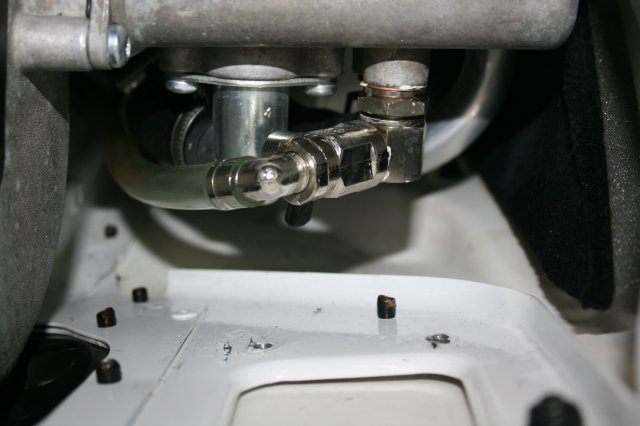 If you look closely at the underside of the valve you will see the end of a black lever. This lever operates a 1/4 turn ball valve and is held closed in a detent by a spring. I positioned the valve this way so that it is protected and still has good access. It is accessible with your left hand reaching between the toe kick and the chaincase